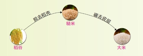 稻谷籽粒由颖(稻壳)和颖果(糙米)两部分组成,颖果又由皮层、胚乳和胚三部分组成,我们所说的大米,主要就是胚乳。要想把稻谷加工成大米,需要帮助大米脱掉两层“衣服”。一层是“外套”,也就是稻壳,稻谷去掉稻壳后就成为糙米;一层是“皮肤衣”,也就是糙米的皮层(包括果皮、种皮、珠心层、糊粉层四部分,也叫糠层)。在稻谷加工过程中,去掉稻壳的工艺,称为“砻谷”;去掉糙米皮层的工艺,称为“碾米”。
