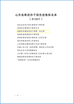近日,省委组织部、省委老干部局、省人力资源和社会保障厅通报表彰全省离退休干部先进集体100个、离退休干部先进个人200名、老干部工作先进集体50个、老干部工作先进个人100名。省粮食和物资储备局老干部第一党支部获评“山东省离退休干部先进集体”。