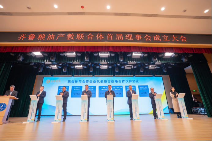 大会选举产生齐鲁粮油产教联合体首届理事会。山东商务职业学院当选理事长单位兼秘书长单位,山东省农业集团有限公司等6家单位当选副理事长单位,山东省粮油检测中心等40家单位当选理事单位。大会同步举行“战略合作协议”“技术创新协议”“校校联合协议”等签约仪式。 中储粮集团山东分公司、山东省农业集团等单位代表及省内外60余家粮油企业、科研院所、高等院校代表共200余人参加会议。
